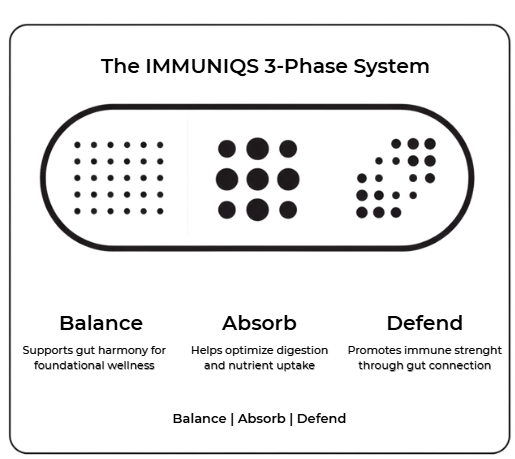 Find real balance and strength. IMMUNIQS™ blends prebiotics, probiotics, and enzymes to fortify your gut, boost immunity, and sustain clear, steady energy every day.